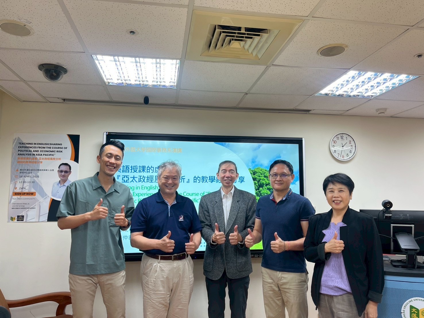 The teacher community “International Affairs, AI, and EMI Synergy”, co-organized by the College of International Culture, Education, and Foreign Affairs and the Department of International Affairs, held a sharing session on April 16, 2025, in Room Z406. The event featured a special guest speaker, Professor Chih-Chieh Chou from the Department of Political Science at National Cheng Kung University. His talk, titled “Teaching in English: Sharing Experiences from the Courses of Political and Economic Risk in Asia Pacific”, focused on the realities and strategies of EMI teaching.