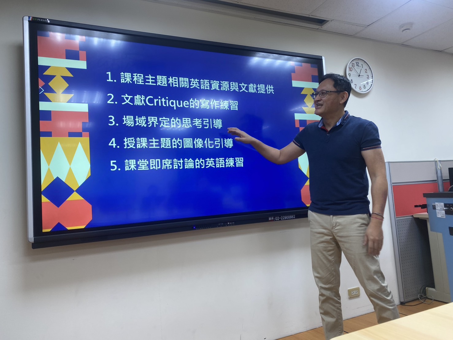 在課程實務層面,周教授以其於研究所開設的「亞太政經風險分析」課程為例,分享從課綱設計、教材選擇、課堂活動、測驗方式到報告要求等,如何整體建構出一個有效的英語學習環境。他強調,授課教師宜提供與課程主題相關的英文資源與學術文獻,協助學生進行課前準備;此外,透過文獻評論(critique)訓練學生的學術寫作能力;在教學簡報中,適時圖像化重點概念,有助於引導學生專注與思考;並透過課堂中的即席討論,鼓勵學生用英語進行意見交流與觀點辯論。