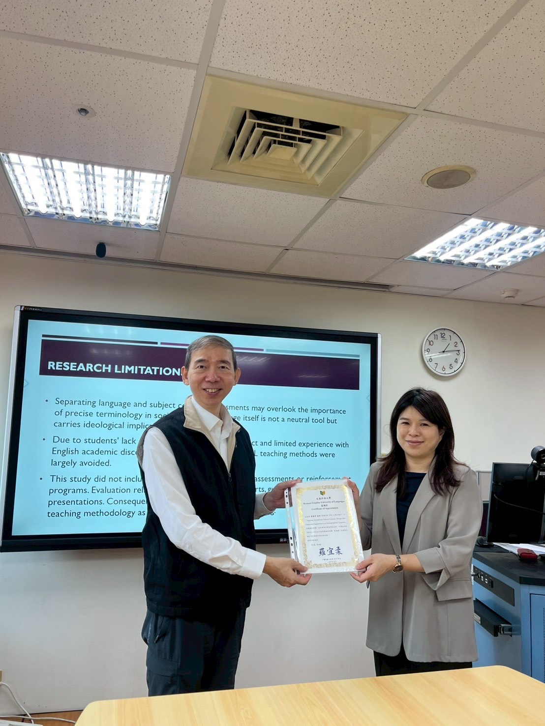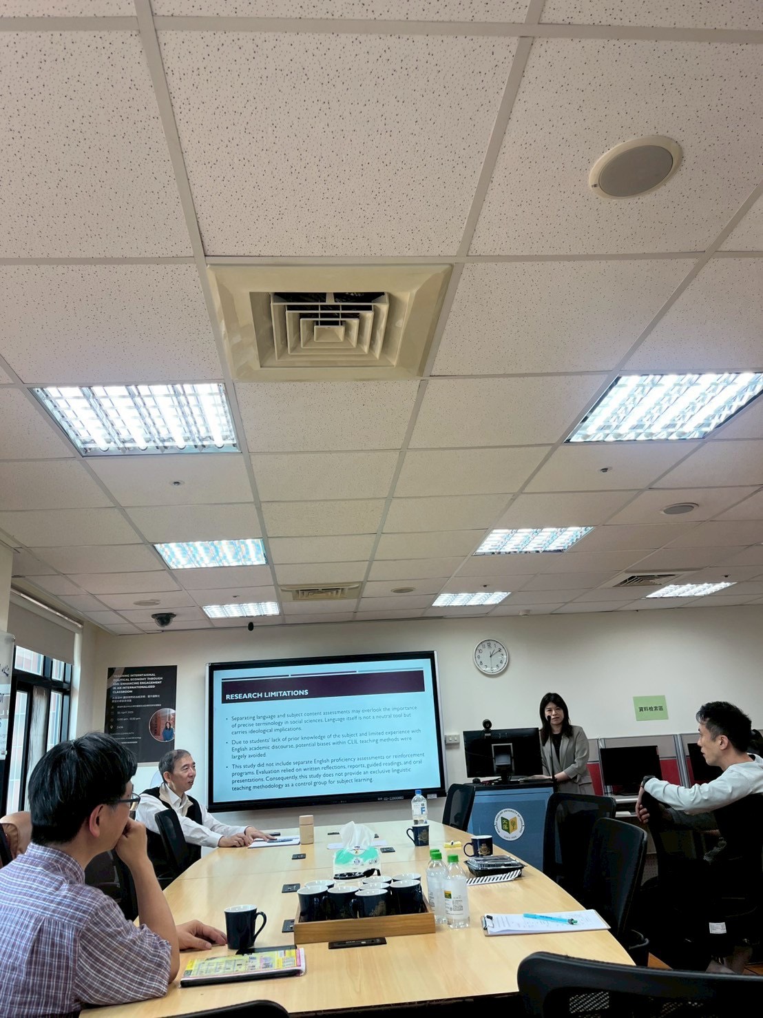 During the discussion, Professors Chen and Chiao from the Department of International Affairs, along with Professor Chang from the Department of English, also raised questions and shared reflections. The session fostered lively exchanges of ideas, with participants expressing a shared hope of further enhancing the effectiveness of EMI instruction in the classroom.
