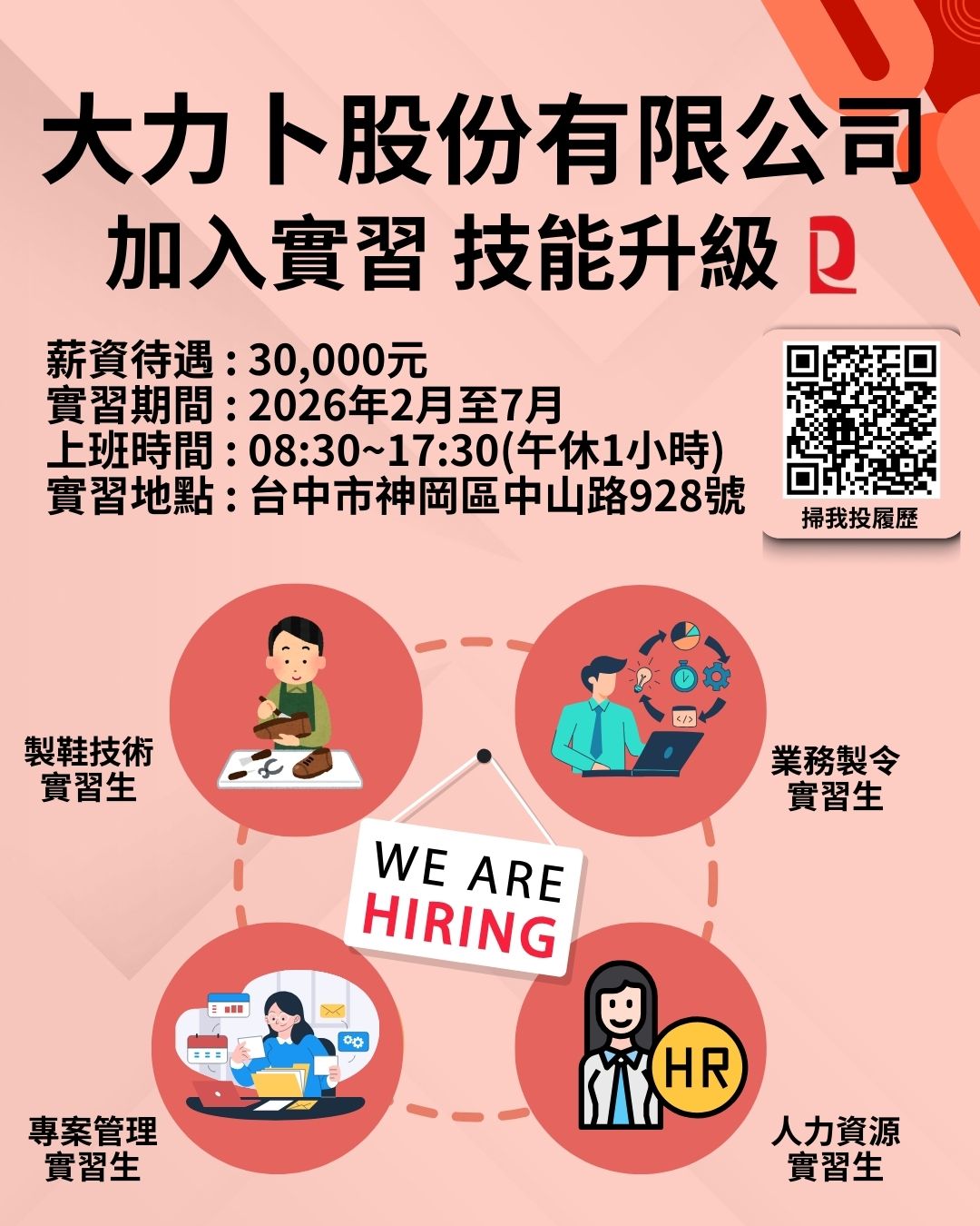 工作部門: 製鞋技術實習生、專案管理實習生、人力資源實習生、業務製令實習生。