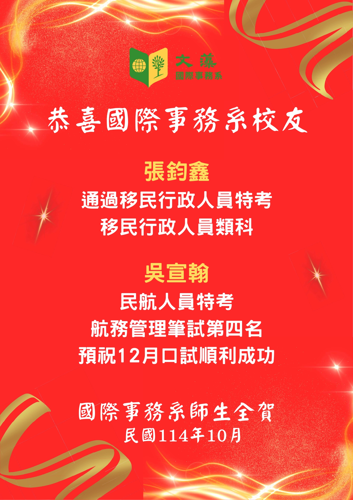 恭喜本系張鈞鑫、吳宣翰系友通過公職特考