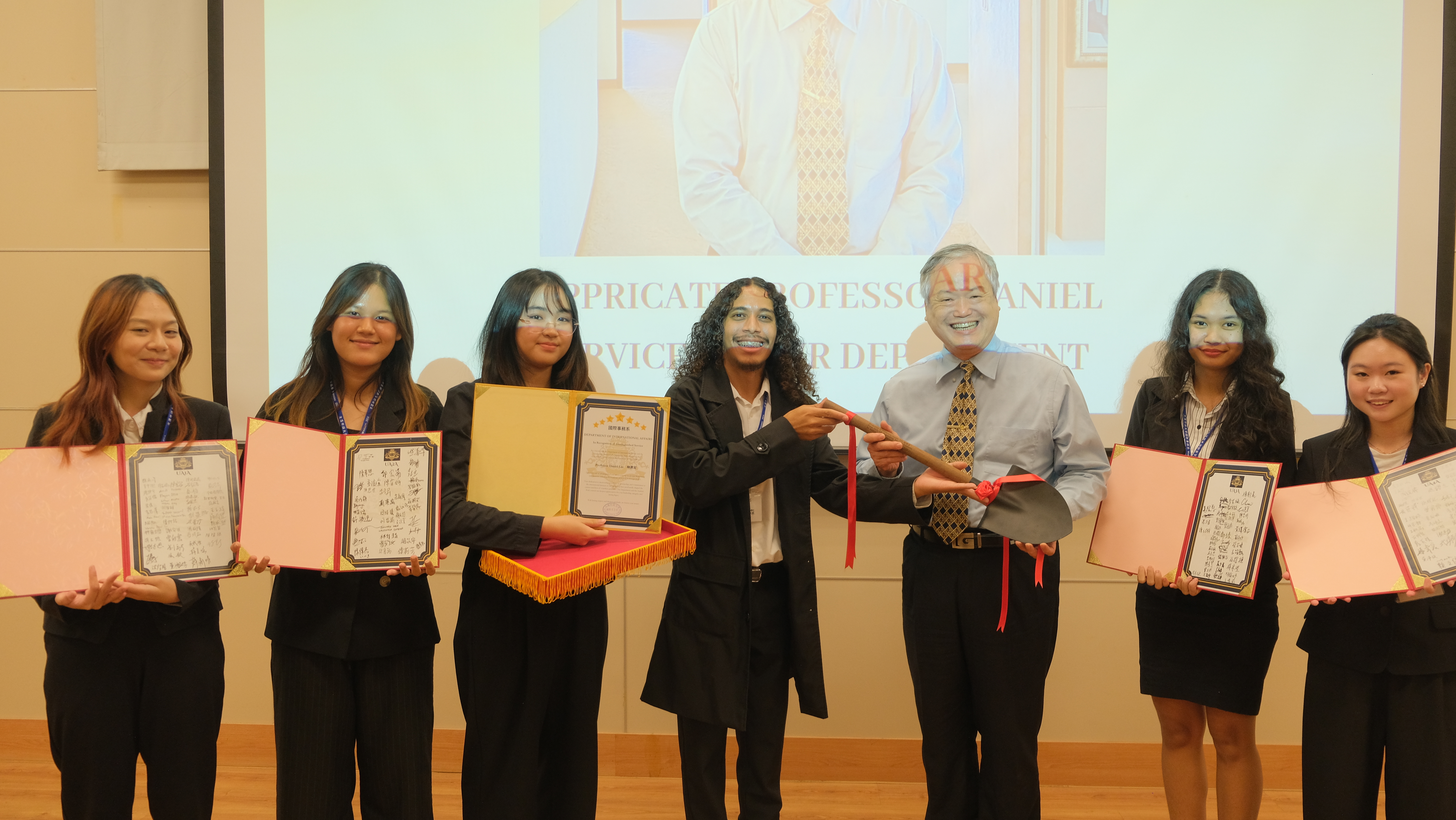 A Memorable Moment: In a heartfelt gesture, faculty and students presented a symbolic shovel to Professor Daniel Lin upon his retirement, honoring his 20 years of dedication and contributions to the Department of International Affairs.