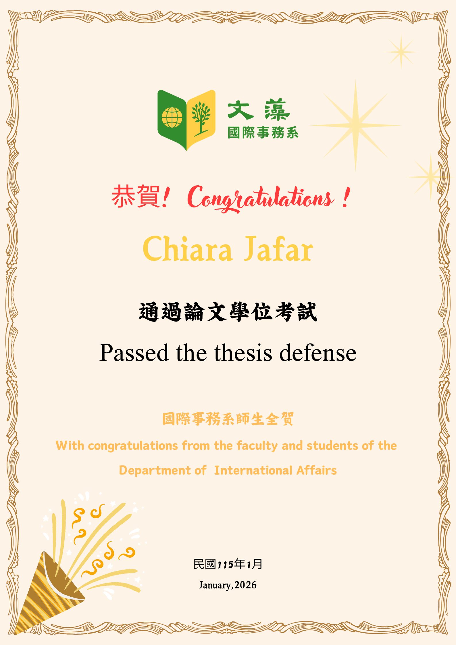 恭喜本系Chiara Jafar通過論文學位考試!Congratulations to our department's student ,Chiara Jafar, on Passing the Thesis Defense!